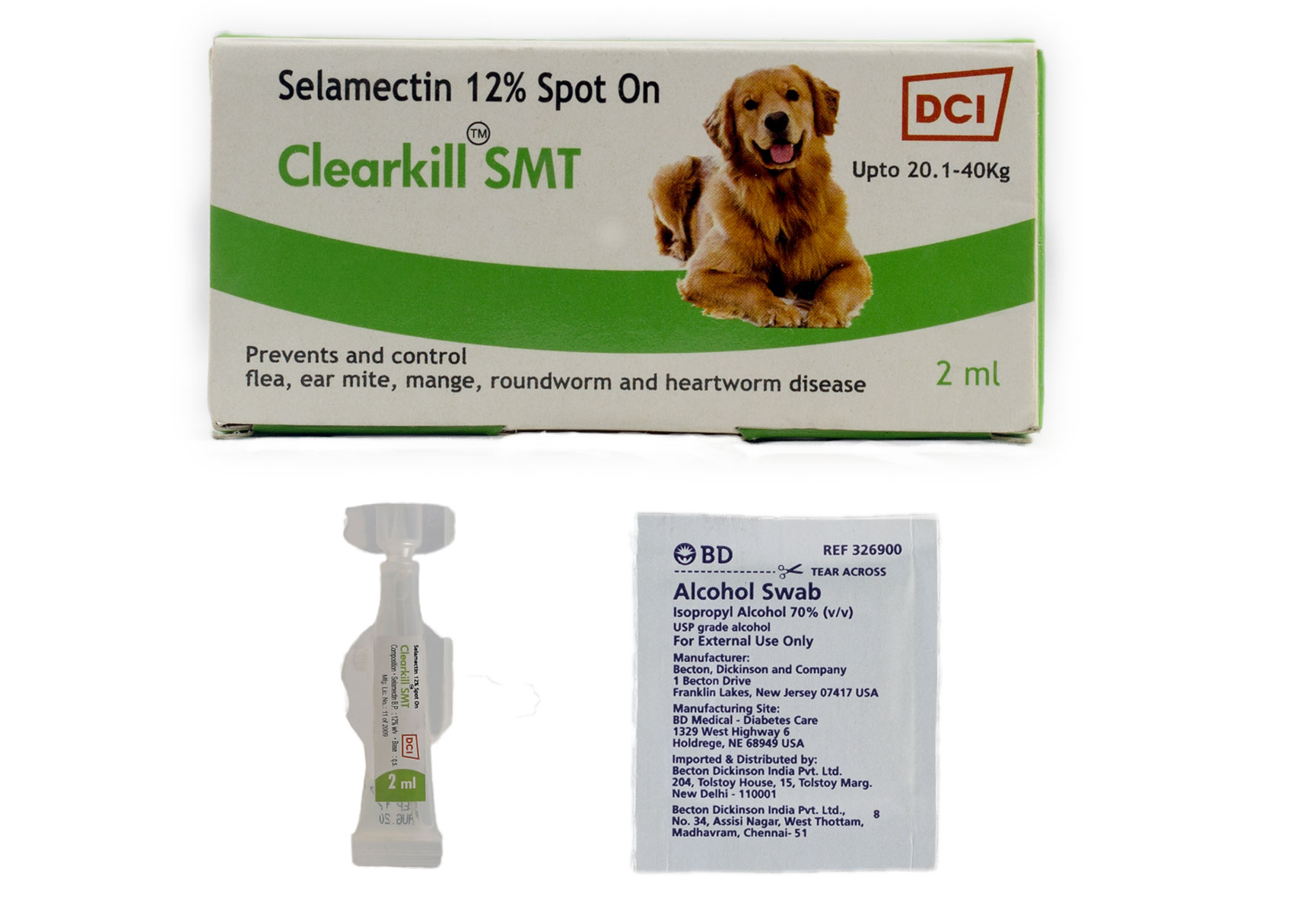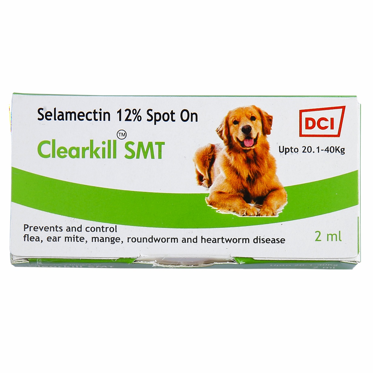- Clearkill SMT Selamectin 12% Spot on 2 ml Prevents and controls flea, ear mite, mange, roundworm and heart worm disease.