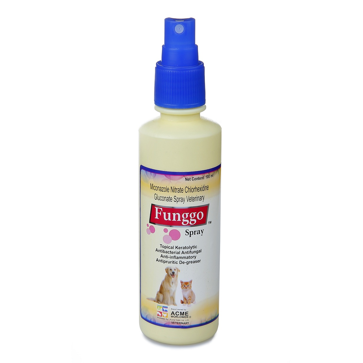 Funggo Spray Provide relief from the dermatological conditions associated with fungal infections such as ringworm, superficial skin infections caused by yeast, and scaling due to seborrhea, Anti fungal Spray for dogs