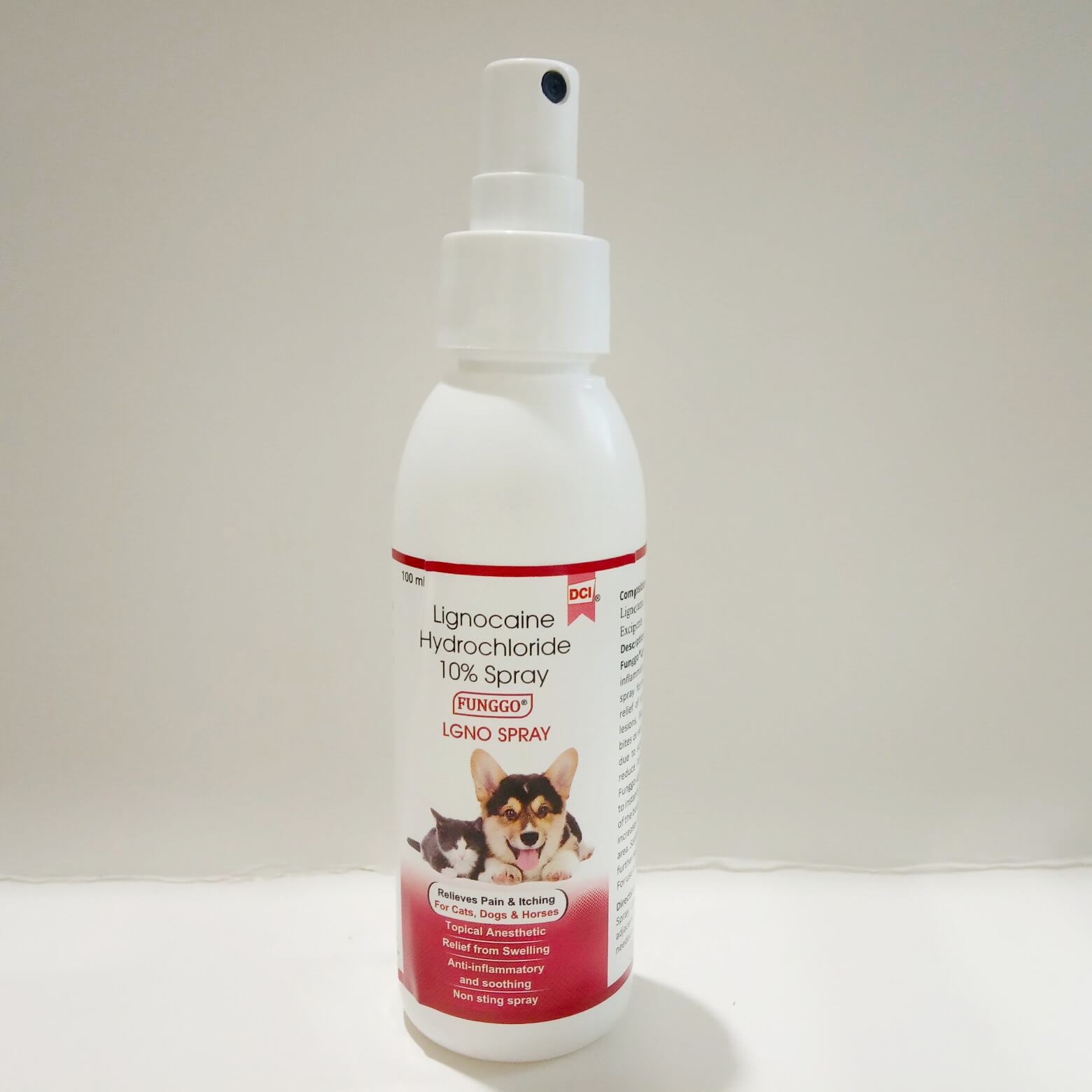 Funggo Lgno Spray reduce itching, redness and swelling. Funggo Lgno Spray acts as an anesthetic to instantly calm pain and numb that part of the body. Lignocaine is a vasodilator, it increases the blood flow at the applied area, Soothing and cooling effect reduces further self-inflicted trauma to the area for use in dogs, cats & horses.