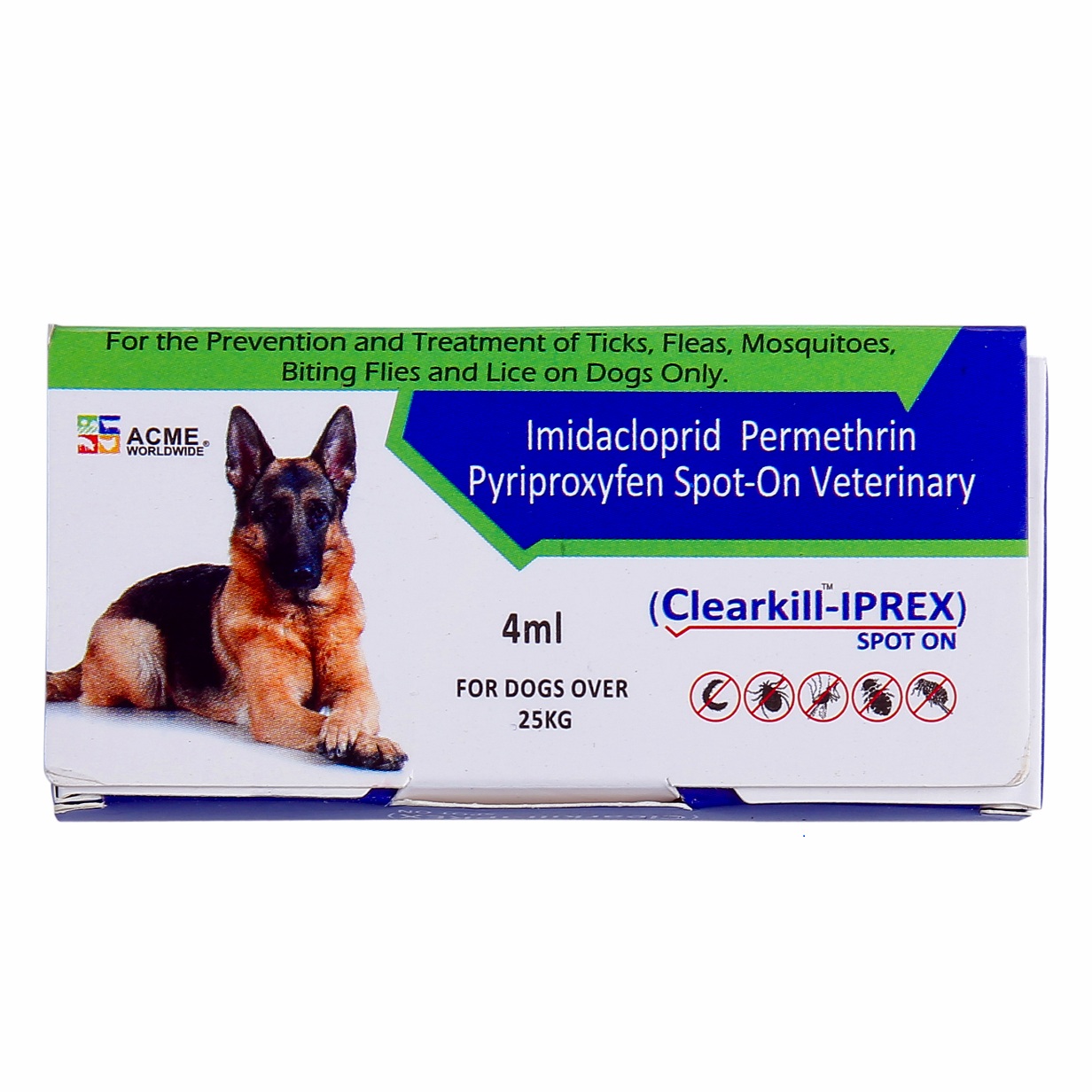 Clearkill Iprex Spot On is used for treatment of Flea Allergy Dermatitis (FAD) in Dogs by rapidly killing fleas and reducing such incidence. For complete prevention and control of Ticks and Fleas.