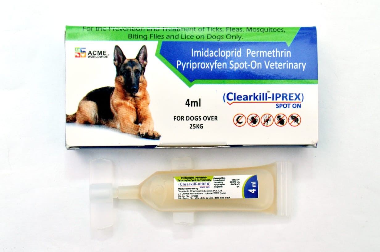 Clearkill Iprex Spot On is used for treatment of Flea Allergy Dermatitis (FAD) in Dogs by rapidly killing fleas and reducing such incidence.